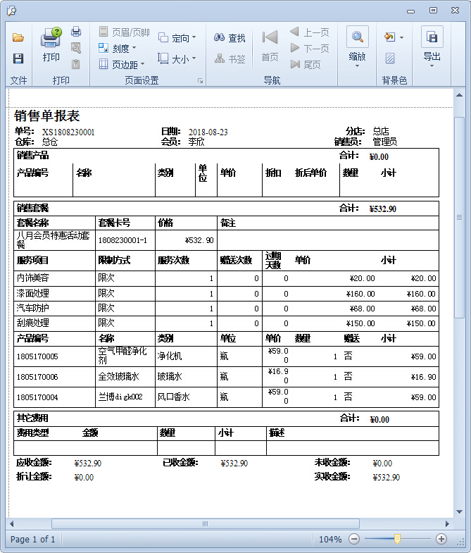 ②軟件支持打印銷售單據,銷售單上標明套餐所包含的服務詳細。如圖: