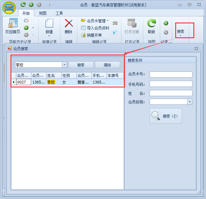 ③會員咨詢套餐剩余次數,如何在傲藍汽車美容店收銀軟件上查詢,根據會員提供的姓名或手機號,可在軟件界面快速搜索會員,如圖: