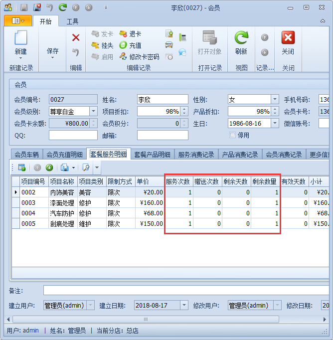 ④進入會員信息管理界面,點擊“套餐服務明細”即可查看會員購買的套餐剩余次數,如圖: