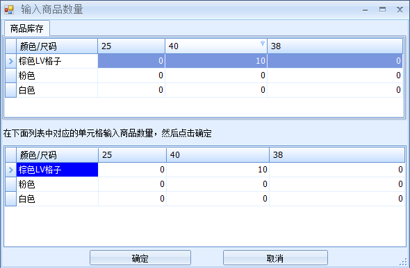 在上圖中雙擊商品,打開輸入商品數量界面,該界面個表顯示的是當前該商品庫存的數量,第二個表在相應的單元格中輸入采購商品的數量。輸入完成后點擊【確定】,該商品的信息就保存到界面。