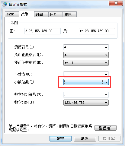 4.進入其他設置,找到貨幣,將小數(shù)點的位數(shù)默認為2