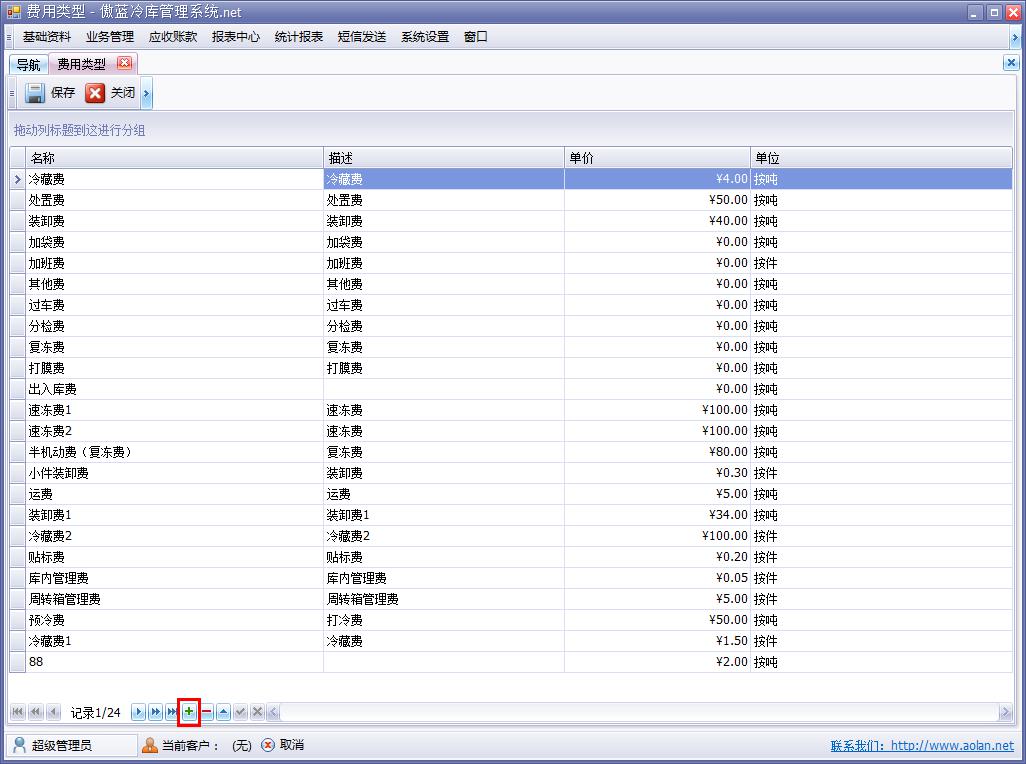 傲藍冷庫管理軟件,費用類型自行設定是系統用戶可根據自身冷庫的實際業務情況,自由設定冷庫業務會涉及到的各項費用,例如:冷藏費與其他各項雜費。