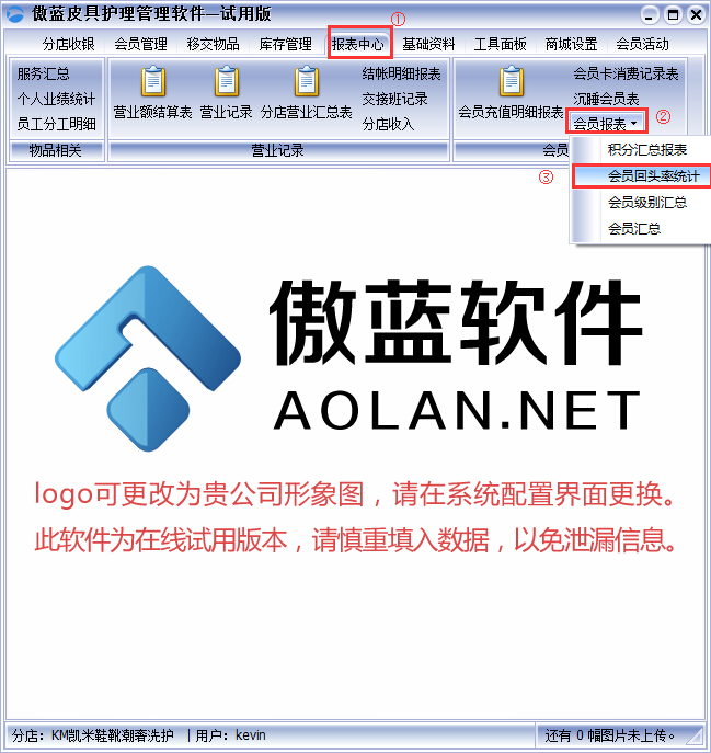 傲藍皮革養護店軟件中,會員回頭率統計報表非常實用,能及時統計會員回頭消費的情況,如何在傲藍皮具修理中心管理軟件查看?如下為您介紹。