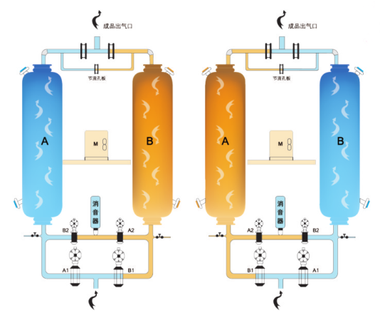 該系列吸干機具有綜合變壓吸附和變溫吸附的優點,在常溫高水汽分壓下吸附(工作):在較高溫度、低水汽分壓下解析(再生)。即吸附劑在吸附過程中吸附的水份,在再生過程依靠高品質再生氣(干燥空氣加熱)的熱擴散和高壓差兩種機理的共同作用而得以徹底清除。