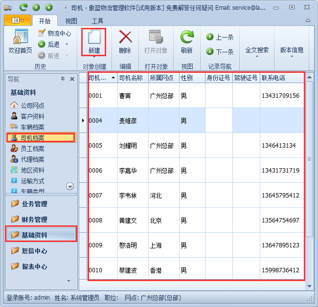 第1步、登錄傲藍物流軟件,點擊“基礎資料”-“司機檔案”,出現司機檔案列表界面。