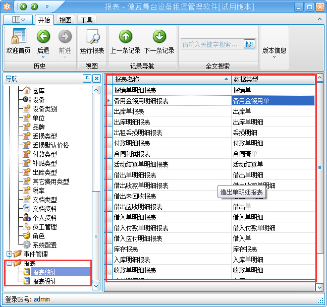 傲藍舞臺租賃軟件應用-出租丟損管理的介紹,管理設備回收過程中發現丟損的設備清單明細,丟損價格賠償等。